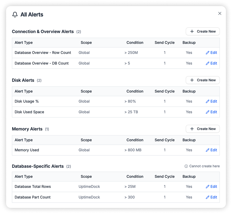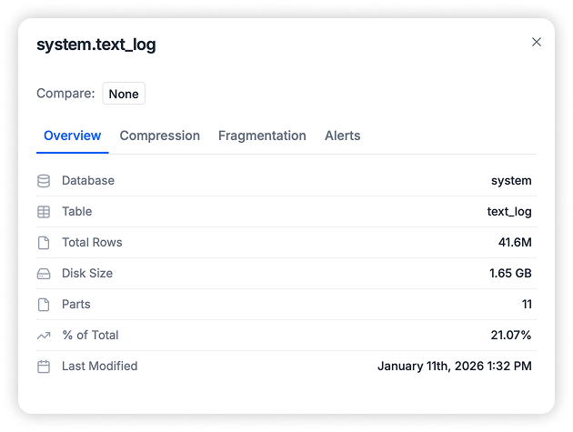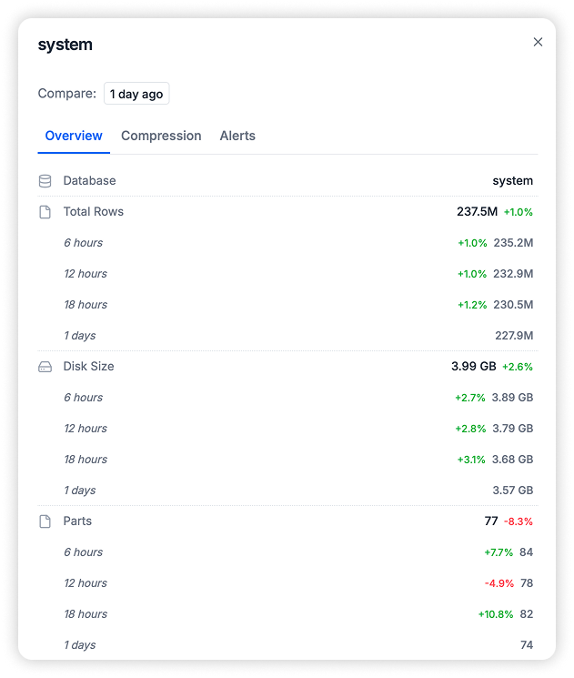 Configure thresholds for database metrics like row counts, disk sizes, table counts, and part counts. Track table-specific alerts including disk size, active parts, and fragmentation levels.