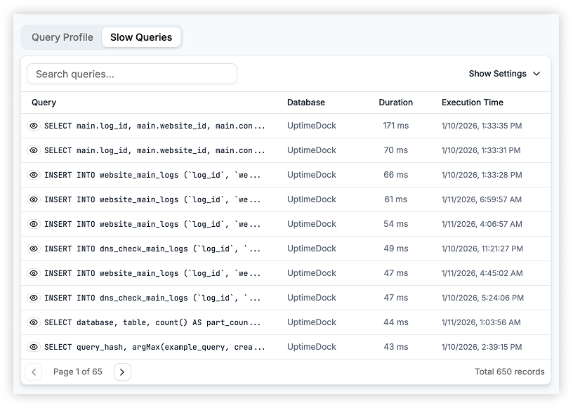 Set up custom alerts for every aspect of your ClickHouse database. Monitor connection status, response times, disk usage, memory consumption, and query performance metrics.